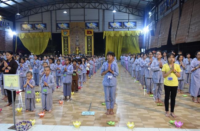Trong khóa tu, chương trình Hoa đăng cầu nguyện được tổ chức thật trang nghiêm và đầy cảm động trong đêm thứ 2 dưới sự chứng minh của ĐĐ. Giác Nhường. Trong sự yên lặng, lắng lòng của các khóa sinh, Sư cô Hòa Liên đã thay các con dâng lời cảm niệm, tri ân đến cha mẹ, ông bà; đồng thời, cũng bộc bạch những lỗi lầm bất kính do các con lỡ phạm phải với cha mẹ, với ông bà, với người lớn. Với giọng truyền cảm và lòng thành kính của Sư cô đã giúp cho các con phần nào nhận ra sự thương yêu của cha mẹ, nhận ra sự lầm lỗi bất kính với người lớn. Từng lời, từng câu nói của Sư cô dường như là những tâm tư của các con, chính vì thế mà các con đã không kiềm được những dòng nước mắt, những dòng nước mắt của sự hiếu thảo, của sự ăn năng mà con trẻ đã biểu lộ trong đêm hoa đăng đầy ý nghĩa này.