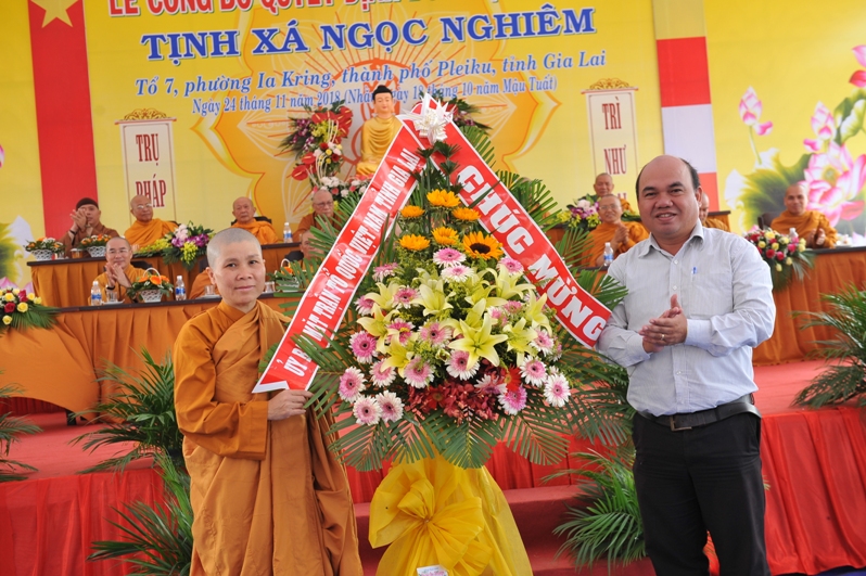 Sau lời giáo dưỡng của Ni sư Hiệp Liên, ông Siu Trung, ủy viên Thường trực Ban dân vận, Ban dân tộc tôn giáo, Uỷ ban Mặt trận Tổ quốc Việt Nam tỉnh Gia Lai cũng đã thay lời lãnh đạo chính quyền chúng mừng Sư cô Tân Trụ trì và mong muốn: Thời gian tới Sư cô tân trụ trì cần tiếp tục phát huy những công việc lợi đạo ích đời, cố gắng phát huy trách nhiệm của mình trước Giáo hội và địa phương. Trong quá trình làm đạo, sư cô cần làm sao thực hành đúng với tâm nguyện lợi pháp độ sanh, mang giáo lý giải thoát áp dụng vào đời sống thường nhật.