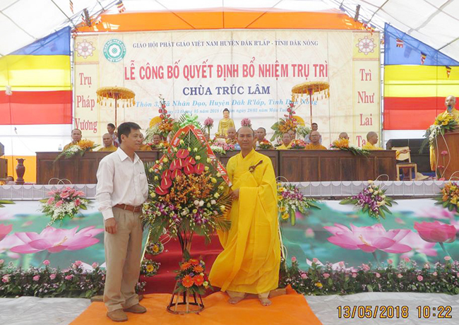 Sáng ngày 13/5/2018, tại chùa Trúc Lâm (xã Nhân Đạo), BTS GHPGVN huyện Đăk Rlấp đã tổ chức lễ trao quyết định bổ nhiệm trụ trì cho ĐĐ.Thích Quảng Bình.Chứng minh và tham dự buổi lễ có: HT. Thích Châu Quang – UV HĐTS, Trưởng BTS GHPGVN tỉnh Đăk Lăk, Chứng minh BTS GHPGVN tỉnh Đăk Nông; TT. Thích Quảng Tuấn – UV HĐTS, Trưởng BTS GHPGVN tỉnh Đăk Nông; ĐĐ. Thích Quảng Hiền - UV HĐTS, Phó ban Thường trực BTS GHPGVN tỉnh Đăk Nông; ĐĐ. Thích Chiếu Ý - Phó BTS GHPGVN tỉnh Đăk Nông, Trưởng BTS GHPGVN huyện Đăk Rlấp, Trưởng ban Tổ chức; ĐĐ. Thích Nhuận Thân - Phó BTS GHPGVN tỉnh Đăk Nông; quý Tôn đức trong Ban Thường trực BTS GHPGVN tỉnh, chư Tôn đức các tự viện, tịnh xá trong và ngoài tỉnh; đặt biệt có sự tham dự rất đông của quý Tôn đức thuộc Tổ đình Phước Viên (TP. Biên Hòa); cùng sự tham dự của đông đảo Phật tử.