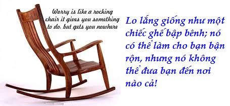 Lo lắng những điều không mang lại cho bạn một giải pháp thiết thực chẳng khác nào như đang ngồi trên chiếc chiếc ghế bập bênh (rocking chair), thấy có đong đưa chuyển động, nhưng chẳng đưa bạn đi tới đâu cả! Lo lắng cũng giống một con chuột chạy trên bánh xe, cứ lòng vòng rồi cũng chẳng tới đâu. Có chăng, nó chỉ tạo nên một cảm giác ảo như thể đang chuyển động! Lo lắng không thay đổi bất cứ điều gì ngoại trừ làm cho bạn đau khổ.
