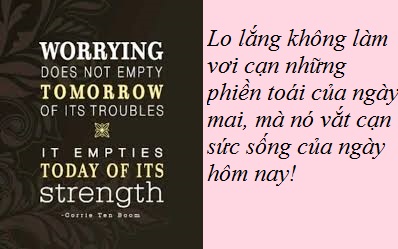Nên nhớ: Lo lắng không làm vơi cạn những phiền toái của ngày mai, mà nó vắt cạn sức sống của ngày hôm nay. Lo lắng không thể lấy đi những phiền toái của ngày mai, nhưng nó lấy đi sự bình an của ngày hôm nay!